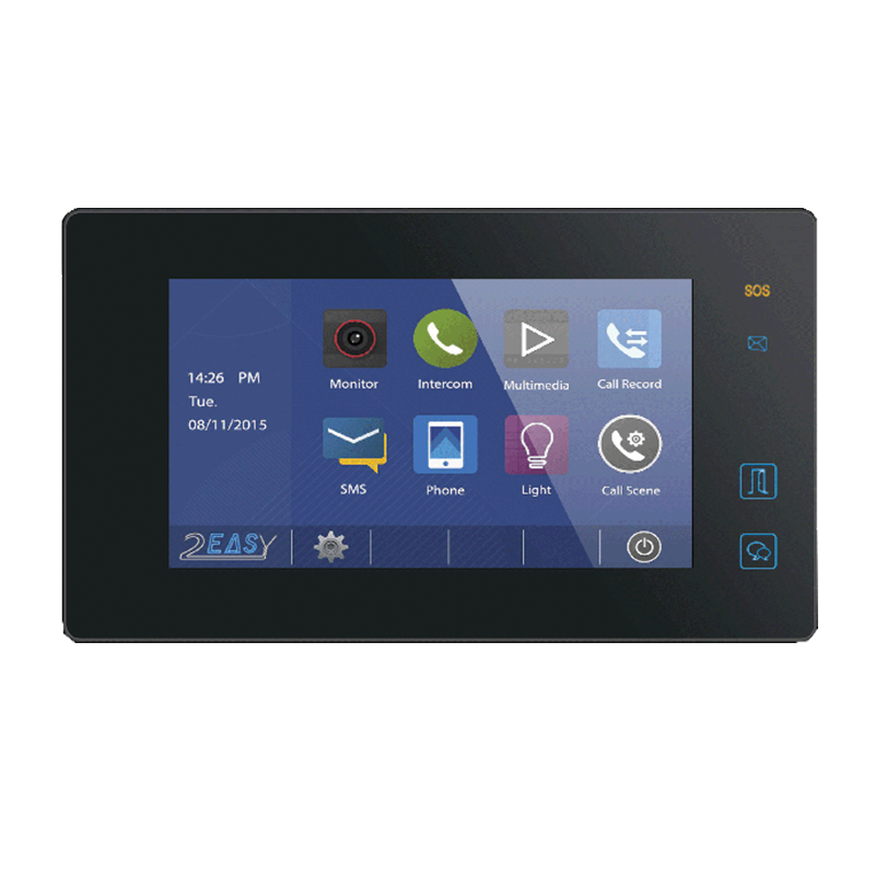 Post de interior video cu conexiune pe 2 fire si ecran color LCD de 7” 800x480 cu touch screen. Touch screen capacitiv de inalta rezolutie. Memorie foto/video integrata. Captura video cu sunet in timpul convorbirii, model subtire, ultra plat, butoane cu senzor de atingere iluminate, buton SOS dedicat (trimite SMS prin modulul DT-GSM).