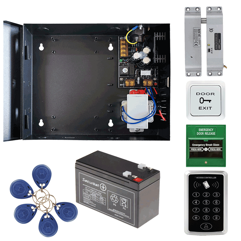 Kit de control acces, autentificare cu card de proximitate, pentru orice tip de usa de acces. Kit pt. o usa de orice tip. * 1 x Controler de acces SR-M2EM * 1 x Sursa de alimentare S-12V * 1 x Acumulator 12V 7Ah * 25 x Card de proximitate ISO, TK4100, 125KHz * 1 x Buton de panica * 1 x Buton de iesire aplicabil * 1 x Electromagnet de forta aplicat SM-280-S