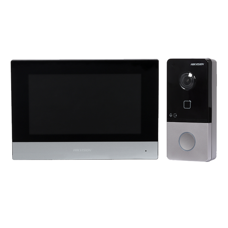 DS-KIS603-P este un kit videointerfon de la Hikvision. Acesta este alcatuit dintr-un post de interior DS-KH6320-WTE1 (microfon si difuzor incorporate) si un post de exterior DS-KV6113-WPE1 (microfon si difuzor incorporat), ambele permitand comunicare bidirectionala. DS-KH6320-WTE1 are ecran tactil color de 7 inch si o rezolutie de 1024 × 600 pixeli. DS-KIS603-P permite conectarea si vizualizarea camerelor IP de la Hikvision, putand fi conectat la retea prin portul RJ45 10/100 Mbps, auto adaptiv. Postul de exterior DS-KV6113-WPE1, cu ajutorul senzorului performant, permite o rezolutie video inalta de 2 Megapixeli (Full HD - 1920 x 1080 pixeli) la 30 FPS cu un unghi vizual generos de 129° pe orizontala. Acest post citeste tag-uri si cartele de acces de tip Mifare la o frecventa de 13.56 MHz. Beneficiaza de mai multe functii speciale cum ar fi BLC, DNR, WDR, IR, detectare miscarii, avand si functie de reducere a zgomotului si anulare a ecoului. Pe timp de noapte, poti vizualiza imagini clare pana la o distanta maxima de 3 m cu ajutorul LED-urilor cu IR. Postul de exterior are un grad de protectie IP65 (rezistenta la apa si praf) si iluminator IR pe o distanta de pana la 3 m. Ambele posturi suporta TF card de pana la 32 GB care nu este inclus in pachet. Montajul se va realiza aparent. Alimentarea se va face la 12V DC sau PoE, iar temperatura optima de functionare pentru postul de interior este cuprinsa in intervalul -10°C si +55°C, in timp ce pentru cel de exterior intre -40°C si +60°C.