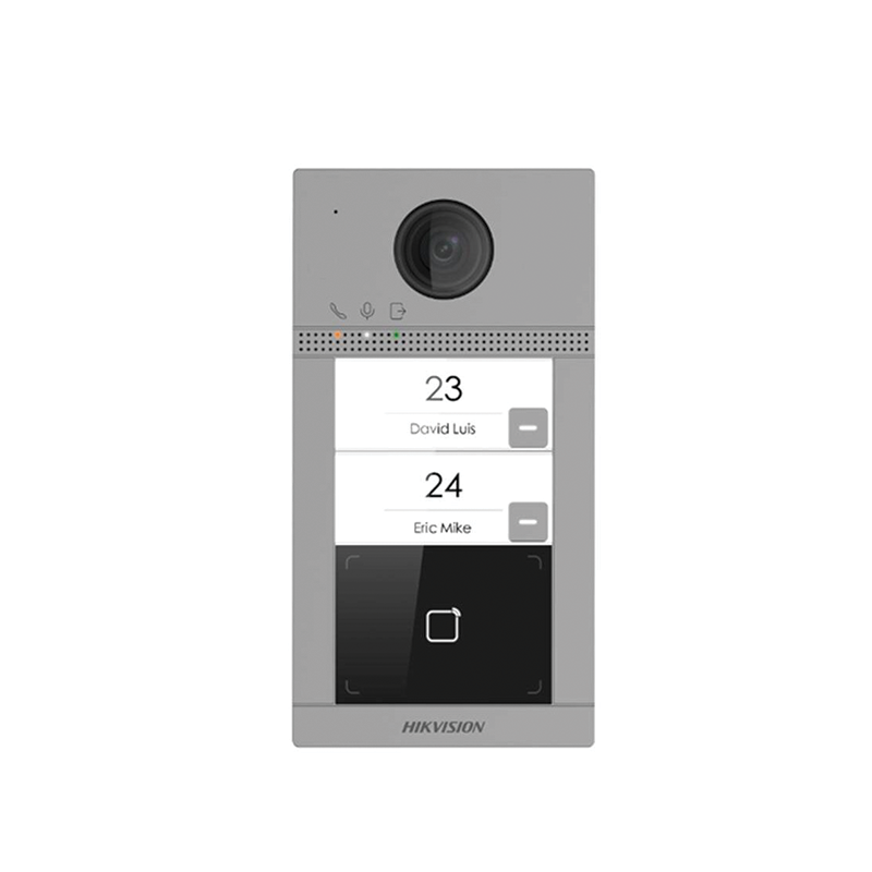 Post exterior VideoInterfon IP pentru 2 apartamente FullHD 1080p pentru montare la exterior: camera video color rezolutie 1920x1080 pixeli, deschidere obiectiv 124 grade, Wide Dynamic Range, iluminator InfraRed efectiv pana la 3 metri, microfon, difuzor puternic (80 dB la 30 centimetri), RJ- 45 10/100 Mbps Self-Adaptive Ethernet Interface, WiFi 2.4GHz 802.11 b/g/n , 13.56 MHz Mifare Card Reader, 2000 utilizatori, intrare contact magnetic pentru Door Magnetic Status, RS-485 Half-Duplex Port, I/O Input 4/1, alimentare 12Vcc/POE IEEE802.3af, carcasa metalica din aliaj de aluminiu AntiVandal IK08, Weatherproof IP65, temperatura de functionare -40C pana la +53C, dimensiuni, 174 mm × 91 mm × 29 mm, montaj aparent. Deschide (deschide contact) usa cu card-uri control acces Mifare (Card Mifare 1k CARD, AR-TAGCI3W50F-MF06, AR-TAGCI3W50F-MF06, AR-TAGK73W20FMF08). Realizeaza automat poze la deschiderea usii. Soneria apeleaza cu video SmartPhone-ul sau tableta Android/iPhone cu aplicatia HIK-Connect instalata.